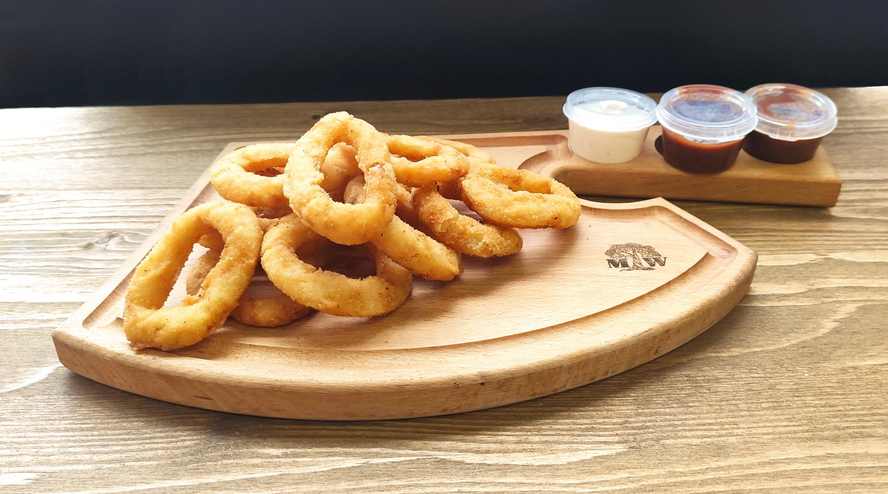 Порция луковых колец с соусом на выбор!
